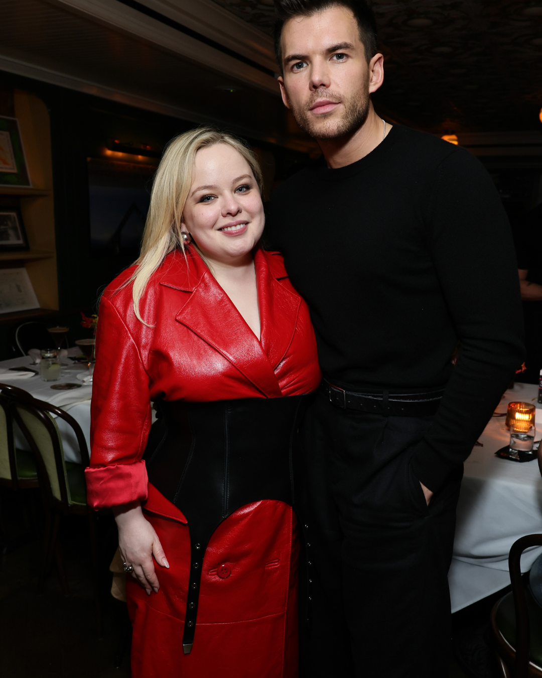 Bridgerton actress Nicola Coughlan attended the "Chaos Dinner" hosted by Evan Ross Katz and Threads by Instagram in New York City, wearing the PRITCH "Portrait" Vintage Leather Coat in Red with the Suspender Corset Belt. She brought a sharp elegance to the evening, embodying PRITCH’s signature edge and her own distinctive style.